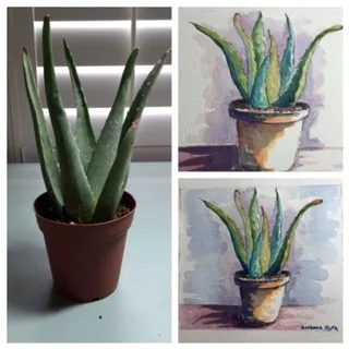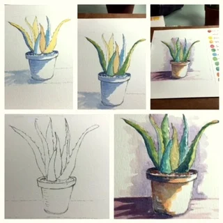 I painted the aloe plant with a series of flat washes. I let each wash dry completely before I painted another wash over it. I painted each leaf individually and moved to another leaf that wasn't touching the wet leaf when I wanted to paint another leaf. I kept adding more layers of washes and left some of the initial layers of wash uncovered, those are generally the lightest tone you see in the painting except the white of the paper. I added darker colors where I needed darker tones. Finally I painted the background with 2 layers of washes.