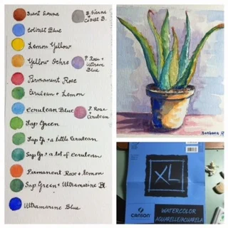 Above is the finished painting, plus samples and names of all the colors I used. I have been testing out inexpensive watercolor papers, and the cover you see in the bottom right picture is the paper I used, Canson, XL 140 lb. watercolor paper. I think it worked fine for this painting.