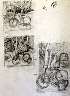 Since I am going to be traveling next week, I am going to give you two assignments right now for this week and next. I used for the photo of the bicycle and the tree above. I wasn't exactly sure if it would make a good painting, so I decided to try out different arrangements or compositions of it in value sketch form.