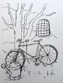 I always draw 3 value sketches in order to come up with 3 different patterns of values, (you must have at least 3 values, light, medium and dark plus the white of the paper or more) and differing arrangements of the objects in the pictures. You can see from my sketches that I moved the wire structure to the right of the picture and added branches to the tree plus moved around the watering can. I ended up liking the bottom right sketch the best, so I made that into a line drawing to paint.