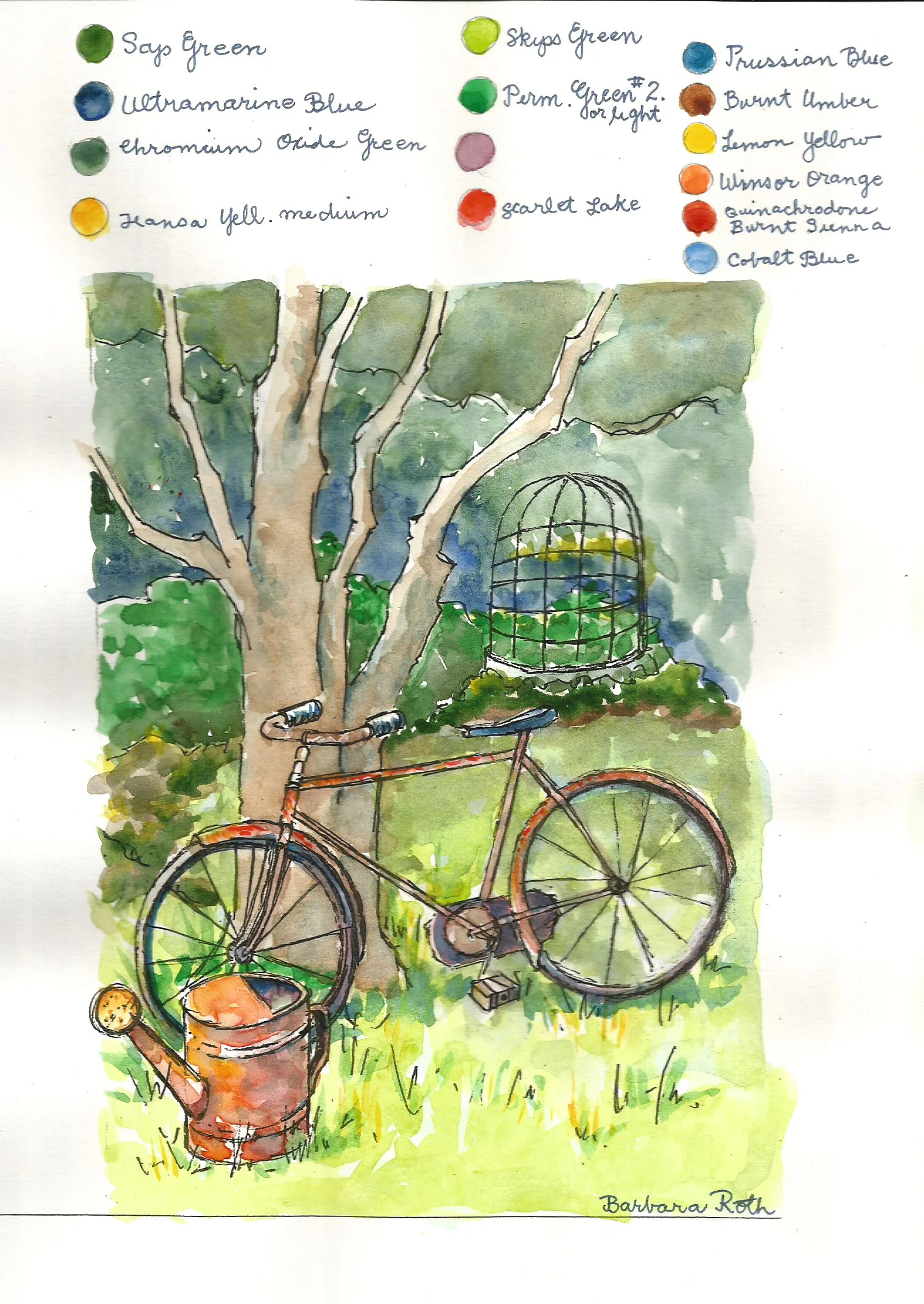 In the watercolor painting below , I tried to use lots of different mixtures of green. I hope you can see by looking at it, that some greens are closer to lemon, some greens have a bit of turquoise in them, some of the greens are close to a "kelly green" and some have a bit of purple or red.
