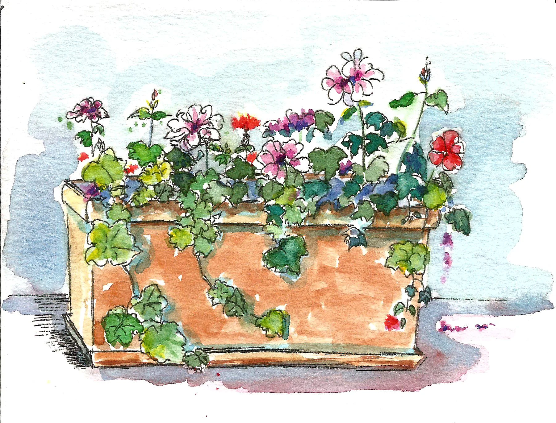 I think it time to talk about getting the color you want in your paintings. In the painting of the geraniums I painted the leaves lots of different versions of green to make the picture interesting and also to make some of the leaves stand out. The easiest way I have found to create different greens is to start with sap green and mix in another color or two to get the exact color I want. If you don't have sap green in your paint box, pick out another green and try adding the colors I list here. For the yellow green leaves, I added lemon yellow. For the medium green leaves, I added cobalt blue. For the dark blue green leaves I added thalo blue and for the grey green leaves I added cerulean blue. Find the leaves in the painting, that catch your eye, are they yellow green? That was my intention.