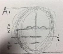 You then draw almond shapes the approximate size of eyes and put them on the horizontal line. As a general rule there is one eye shape length in between the two actual eyes. Check out my drawing. You'll see in the drawing that the bottom half of the face is divided in half and there is a line. On that line is where generally your faces nose ends. If you look again at my face drawing you'll see the remaining space below the nose is divided in half and a line is drawn. That line is where the mouth is drawn as a general rule.