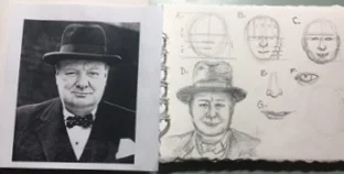 When you get to the stage in drawing a face when you want to draw the features you also have to use two skills I've already told you about. First find the basic shapes underneath the shape you want to draw and then you may also need to use your contour drawing skills to really look at the shape of the eye or the nose or the lips and draw what you see. This is just drawing practice so it doesn't have to be perfect. Also in my photo of Churchill it was difficult to see his ears so I sort of had to fake it. My finished drawing of him isn't perfect, but its a start. Remember to look at your drawing from a distance and you can judge how it looks more clearly. If something looks too big or too small, just adjust it. That's what erasers are for.