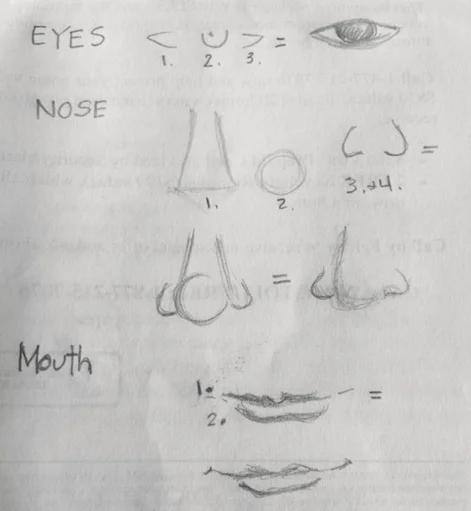 The chart below shows the shapes that make up the features and how to put them together so they add up to eyes, nose and a mouth.
