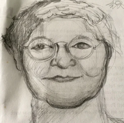 Since drawing faces can be a little challenging, I decided to add these two pictures to show you how all the shapes might fit together and that your face drawings don't have to be perfect. Look at my drawing below, I sketched it this morning from a photo I found of a "kind face" on the net.