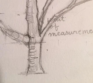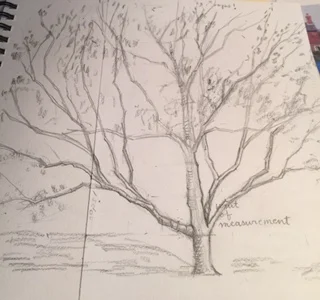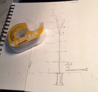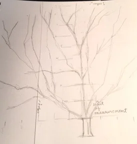 Start drawing your tree by finding a unit of measurement. I used the tree trunk and found the total tree measured 10 trunk lengths. Then I drew 10 trunk lengths on my paper and found I had drawn the first trunk too big, so my 9 and 10th trunk went off the paper and I had to start again. I also measured how many trunk lengths were in the width of the tree and found I either needed to start over or tape a piece of paper to my original paper. You can see above I chose the tape option.